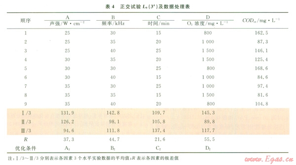 從上述實(shí)驗(yàn)研究可知,單獨(dú)采用聲化學(xué)處理后CODcr還有l 382 mg/L,達(dá)不到排放標(biāo)準(zhǔn)。因此,采用聲化學(xué)復(fù)合臭氧氧化技術(shù)進(jìn)行處理,考察聲強(qiáng)、頻率、臭氧濃度、時(shí)間對(duì)處理效果影響,設(shè)計(jì)正交試驗(yàn)進(jìn)行優(yōu)化工藝的確定,結(jié)果如表4所示。