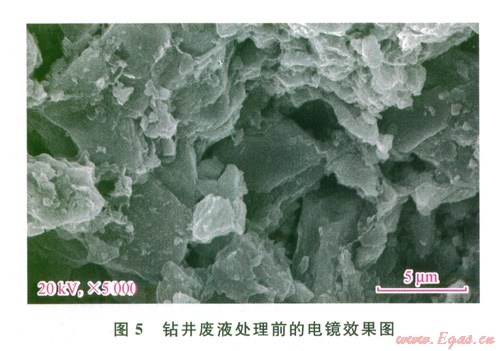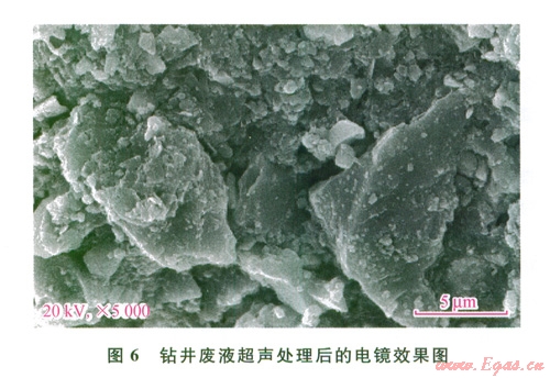 對(duì)鉆井廢液在超聲波作用前后進(jìn)行電鏡掃描分析,效果如圖5、6所示。