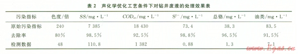 從表2可以看出,經(jīng)過聲化學(xué)復(fù)合技術(shù)對(duì)鉆井廢液進(jìn)行處理后,其處理效果非常明顯,處理后所有的污染指標(biāo)濃度均下降大,其中總鉻、油類、色度、S-2達(dá)到一級(jí)排放標(biāo)準(zhǔn);SS達(dá)到二級(jí)排放標(biāo)準(zhǔn)。CODcr從18 430 mg/L降到l 382 mg/L,去除率達(dá)到92.5%。