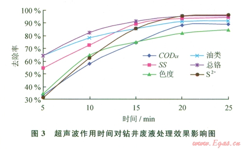 2.3.3 超聲波作用時(shí)間對(duì)鉆井廢液處理效果的影響