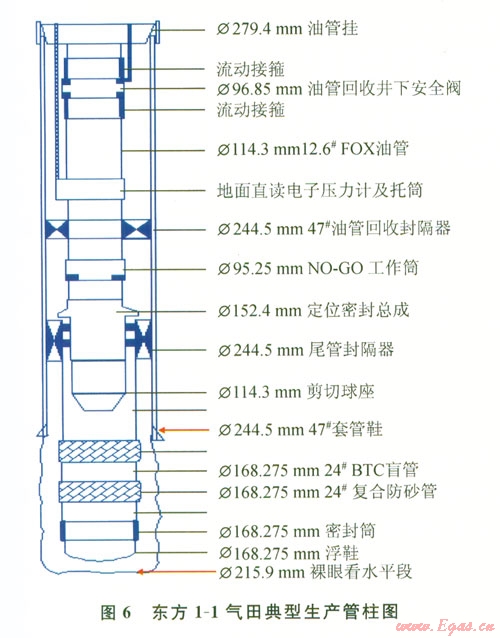 東方l-1氣田具有高產(chǎn)、C02含量較高的特點(diǎn)。作為中海油自營(yíng)開發(fā)的首個(gè)氣田在開發(fā)所面臨的最大問題就是安全開發(fā)問題。作為安全生產(chǎn)的第一屏障生產(chǎn)管柱結(jié)構(gòu)的設(shè)計(jì)選擇尤其重要。生產(chǎn)管柱的設(shè)計(jì)和下人須滿足低壓力損耗,使用壽命長(zhǎng),滿足氣藏動(dòng)態(tài)監(jiān)測(cè)的要求[2]。油管選用強(qiáng)度高、密封性好、內(nèi)孔平滑和可多次重復(fù)上扣l3Cr FOX油管。上部設(shè)計(jì)井下安全閥,保證氣井在緊急狀況下安全可靠關(guān)閉,及時(shí)切斷氣源。安全閥為全金屬密封(氣密封)。采用雙封隔器結(jié)構(gòu)保證安全生產(chǎn)的需要,增加封隔油套管環(huán)空的可靠性,降低完井作業(yè)返工率:第一密封由插人密封總成與防砂尾管懸掛封隔器組成,第二密封為油管回收封隔器。管柱底部用液壓剪切坐封球座,避免在大斜度井鋼絲作業(yè)坐封封隔器(圖6)。