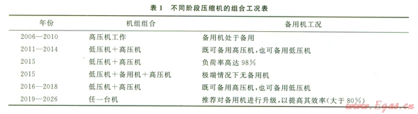 根據(jù)壓縮機(jī)的組合工況進(jìn)行機(jī)組串聯(lián)、切換工藝設(shè)計(jì)。機(jī)組切換、串聯(lián)時(shí)上級壓縮機(jī)組會(huì)對下一級機(jī)組產(chǎn)生巨大的沖擊,為此,利用機(jī)組喘振工藝,修改了濕氣壓縮機(jī)軟件,使用入口旋流分離器和出口海水冷卻器,通過喘振閥形成小循環(huán)把機(jī)組運(yùn)轉(zhuǎn)起來,實(shí)施精確控制,以實(shí)現(xiàn)多機(jī)組的切換和串聯(lián)運(yùn)行。不同階段壓縮機(jī)的組合工況見表l。