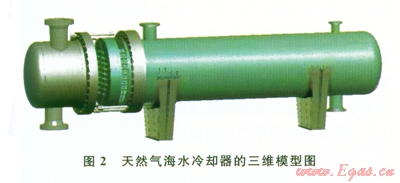 天然氣經(jīng)過濕氣壓縮機(jī)強(qiáng)力壓縮后,溫度升高,進(jìn)入下一道工藝流程前需要進(jìn)行冷卻降溫。天然氣海水冷卻器是利用清潔、環(huán)保、廉價(jià)的海水來冷卻天然氣的管殼式換熱裝置(圖2),采用管內(nèi)和管外單相強(qiáng)制對流換熱理論研制而成,是典型的間壁式換熱裝置。海水冷卻器受壓部件工作在海水和含C02濕天然氣的腐蝕環(huán)境中,所以,其良好的耐蝕性、抗振性和經(jīng)濟(jì)性是產(chǎn)品研制的關(guān)鍵技術(shù)問題。