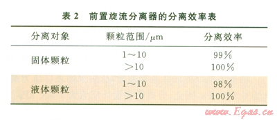 壓縮機(jī)采用三級增壓,每級壓縮機(jī)前采用旋流分離器去除來氣中的游離水及固體顆粒。為確保系統(tǒng)正常工作,要求各壓縮機(jī)能夠如以下模式工作:模式l,第一級、第二級和第三級前置分離器都可以作為第一級前置分離器使用;模式2,第二級、第三級都可以作為第二級前置分離器使用;模式3,第二級、第三級都可以作為第三級前置分離器使用。這就要求各旋流分離器在3種工況下都能夠正常工作。為此,選用了具有高分離效率的導(dǎo)葉式旋風(fēng)管(圖1)。前置旋流分離器的分離效率[2]見表2。