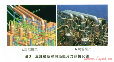 1)采用三維設(shè)計(jì)軟件PDMS搭建1:1的設(shè)備、結(jié)構(gòu)和管線模型。東方1-1氣田二期開發(fā)工程項(xiàng)目濕氣壓縮機(jī)工程引進(jìn)三維設(shè)計(jì)軟件PDMS,在項(xiàng)目的設(shè)計(jì)中避免了很多大尺寸管線、設(shè)備、支架的碰撞問題,方便指導(dǎo)項(xiàng)目施工作業(yè)。三維模型和現(xiàn)場照片對照情況見圖3。
