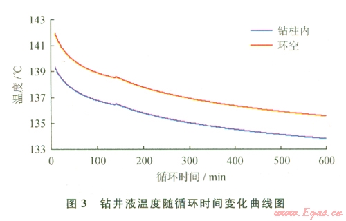 圖3反映了鉆柱內(nèi)和環(huán)空鉆井液溫度隨循環(huán)時(shí)間的變化規(guī)律。
