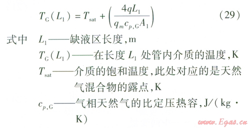 由于在兩相區(qū)熱流密度變化不大,所以在缺液區(qū)取與流動(dòng)沸騰區(qū)相同的熱流密度值和管內(nèi)流體表面?zhèn)鳠嵯禂?shù)值。缺液區(qū)管內(nèi)流體的溫度計(jì)算公式為: