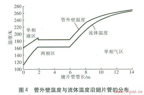 本文對(duì)LNG空溫式氣化器單根翅片管的換熱進(jìn)行了模擬計(jì)算,計(jì)算時(shí)沿管長(zhǎng)方向?qū)⒊崞芊譃閱蜗嘁?、兩相與單相氣3區(qū),得出了管外壁溫度、LNG(或氣態(tài)天然氣)溫度以及管內(nèi)流體表面?zhèn)鳠嵯禂?shù)沿管長(zhǎng)的分布。翅片管的換熱計(jì)算是進(jìn)行氣化器設(shè)計(jì)的關(guān)鍵,通過(guò)進(jìn)行換熱過(guò)程的模擬計(jì)算,可以確定設(shè)備是否能達(dá)到預(yù)定的氣化能力,并且可以分析LNG的組成變化或環(huán)境條件改變對(duì)換熱器氣化效果的影響。本文的計(jì)算結(jié)果可以為LNG空溫式氣化器的設(shè)計(jì)與優(yōu)化提供依據(jù)。