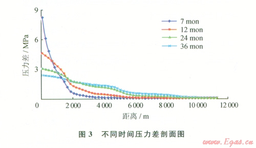 根據(jù)數(shù)值模擬軟件運(yùn)算結(jié)果,繪制典型剖面壓力分布圖,當(dāng)注入7個(gè)月后井底壓力達(dá)到28 MPa,壓力逐漸向外為擴(kuò)散,若假設(shè)不注條件下,由于南區(qū)和長(zhǎng)北合作區(qū)壓力差的存在,壓力波也會(huì)隨時(shí)間的延長(zhǎng)向外擴(kuò)散。用以上兩個(gè)壓力剖面相減,即可得到壓力剖面上注采過程中不同距離與壓力差之間的關(guān)系(圖3)。設(shè)置可以觀察的基準(zhǔn)壓力值,即可得到不同注采周期下,壓力波的傳播距離在1、2、3年的注氣周期下壓力波傳播距離分別為4. km、6.1 km和7.6 km。