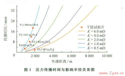 根據(jù)影響半徑計(jì)算公式,取榆林南儲(chǔ)氣庫(kù)建設(shè)區(qū)儲(chǔ)層孔隙度為0.06,天然氣黏度為0.02 mPa·s,綜合壓縮系數(shù)為0.02 MPa-1,分別對(duì)滲透率為0.5~6.0mD等不同條件下傳播時(shí)問與壓力影響半徑進(jìn)行計(jì)算,繪制壓力傳播時(shí)間與距離關(guān)系圖版(圖1)。