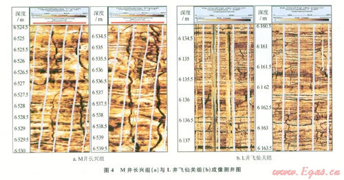 飛仙關組輸導體主要由鮞粒灰?guī)r儲集體和裂縫構成(圖2-b)。根據儲層段巖心物性的統(tǒng)計分析(圖3-b),絕大多數樣品點的孔滲相關性較好,只有極個別樣品點滲透率異常,說明飛仙關組的裂縫不發(fā)育,主要為孔隙型儲集空間。結合成像測井分析(圖4-b),與長興組相比,飛仙關組動態(tài)圖像表現為大套塊狀鮞?;?guī)r特征,裂縫相對不發(fā)育,動態(tài)圖像的色級以黃褐色為主,色級分布較穩(wěn)定,巖性較純而密,物性較差,裂縫與孔隙呈配置較差,輸導效率沒有長興組高。