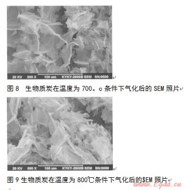 生物質(zhì)炭在蒸汽作用下發(fā)生氣化,其微觀結(jié)構(gòu)也會(huì)發(fā)生變化。使用掃描電子顯微鏡(SEM)對(duì)不同溫度下,生物質(zhì)炭經(jīng)過蒸汽氣化后的微觀結(jié)構(gòu)進(jìn)行研究。生物質(zhì)炭在溫度分別為500、600、700和800℃條件下氣化后的SEM照片分別見圖6~9。