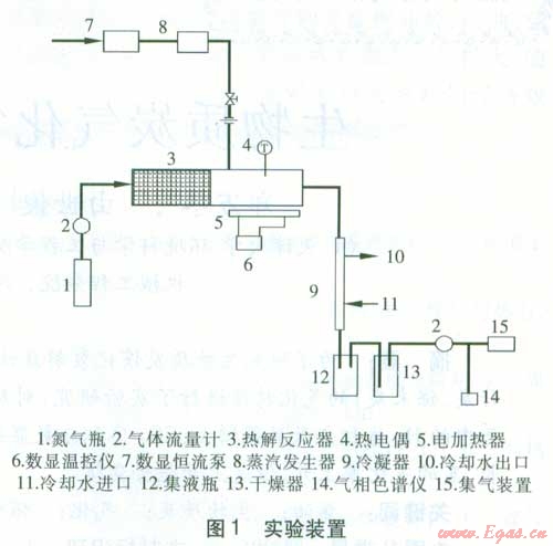 實(shí)驗(yàn)裝置見圖l,該系統(tǒng)包括熱解反應(yīng)器、蒸汽發(fā)生器、熱解氣冷卻裝置、檢測(cè)系統(tǒng)等。熱解反應(yīng)器為長450 mm、內(nèi)直徑為70 mm的不銹鋼圓柱體。熱解反應(yīng)器左端長200 mm的區(qū)域?yàn)椴牧洗娣艆^(qū),右端長200 mm的區(qū)域?yàn)樯镔|(zhì)熱解區(qū),50 mm長的中間問隔是為了減輕材料的預(yù)熱解。生物質(zhì)熱解區(qū)由獨(dú)立的電加熱器加熱,加熱功率為1.5 kW,溫度由K型熱電偶測(cè)量,并由數(shù)顯溫控儀進(jìn)行控制。熱解反應(yīng)器后接1個(gè)長度為300 mm的冷凝器,用以分離可凝結(jié)相和氣體。實(shí)驗(yàn)裝置設(shè)置保溫層,氣體管道采用電加熱的方式保溫,溫度設(shè)定為300℃,主要是為了防止可凝結(jié)相凝結(jié)。水由數(shù)顯恒流泵送入蒸汽發(fā)生器,蒸汽由生物質(zhì)熱解區(qū)最左端加入,其溫度由一個(gè)E型熱電偶測(cè)量,并由溫控器控制。