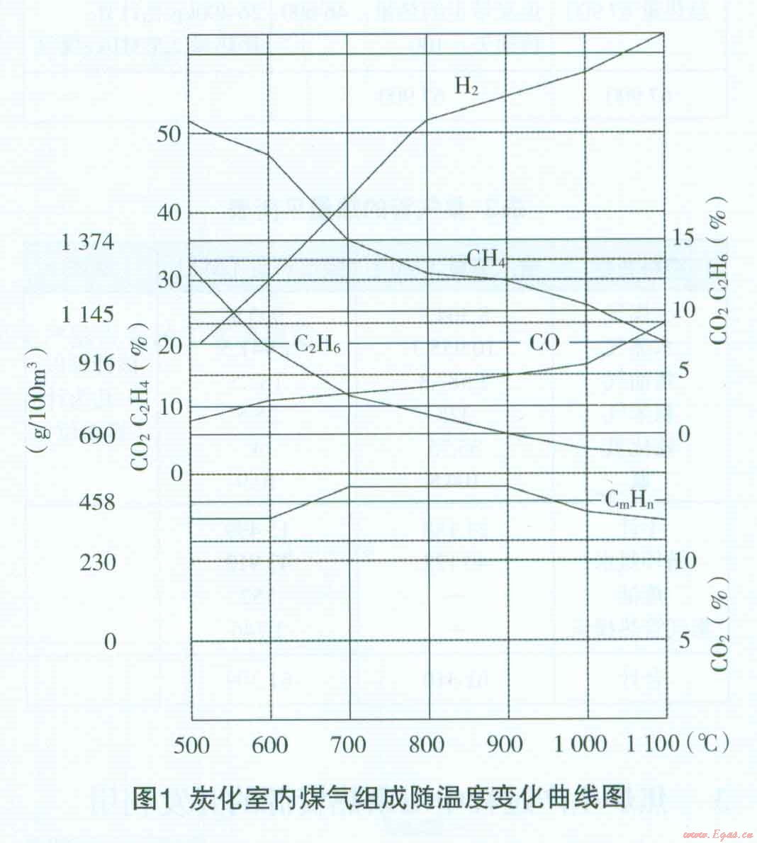 由圖l可以看出,煤氣中甲烷及其同系物,二氧化碳的含量是隨著溫度的升高而降低,而氫及一氧化碳含量是隨著溫度升高而增加的,烴含量在800℃一900℃時達到最大值。