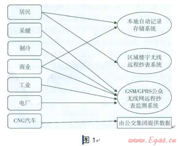 2004年初,結(jié)合“城市燃?xì)夤?yīng)規(guī)劃指標(biāo)、用氣規(guī)律及其用氣量預(yù)測(cè)的研究”項(xiàng)目的開展,北京市燃?xì)饧瘓F(tuán)通過(guò)3種方法在用戶數(shù)據(jù)采集傳輸方面做出了初步的探討與嘗試。該項(xiàng)目將北京市的現(xiàn)有燃?xì)庥脩舴譃榫用?、采暖、制冷、商業(yè)、工業(yè)、電廠、CNG汽車7類,需要采集各類用戶的小時(shí)用氣數(shù)據(jù),根據(jù)用戶性質(zhì)的不同及所用計(jì)量?jī)x表的特點(diǎn)我們分別采取以下3種方法進(jìn)行了燃?xì)庥脩舻臄?shù)據(jù)記錄、存儲(chǔ)、采集與傳輸(見圖l)。