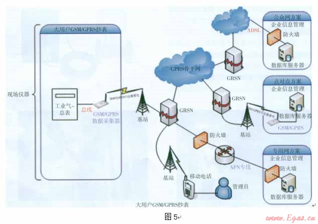 及上位機(jī)數(shù)據(jù)庫(kù)管理軟件系統(tǒng)組成。主要安裝在采暖、制冷樣本用戶及部分商業(yè)、工業(yè)樣本用戶,其利用GSM無(wú)線公網(wǎng)中的數(shù)據(jù)傳輸功能(短消息方式和GPRS無(wú)線網(wǎng)絡(luò)方式)來(lái)實(shí)現(xiàn)對(duì)用戶現(xiàn)場(chǎng)燃?xì)饬髁俊毫Φ葦?shù)據(jù)的遠(yuǎn)距離無(wú)線傳輸(見圖5)。管理人員通過(guò)計(jì)算機(jī)數(shù)據(jù)庫(kù)管理系統(tǒng)采取實(shí)時(shí)讀取存儲(chǔ)數(shù)據(jù),定時(shí)發(fā)送的方式遙控用戶帶有GSM/GPRS燃?xì)獗頂?shù)據(jù)采集傳輸器的現(xiàn)場(chǎng)計(jì)量?jī)x表來(lái)實(shí)現(xiàn)信息采集與傳輸。通過(guò)幾年的使用,該系統(tǒng)運(yùn)行穩(wěn)定,抄表率較