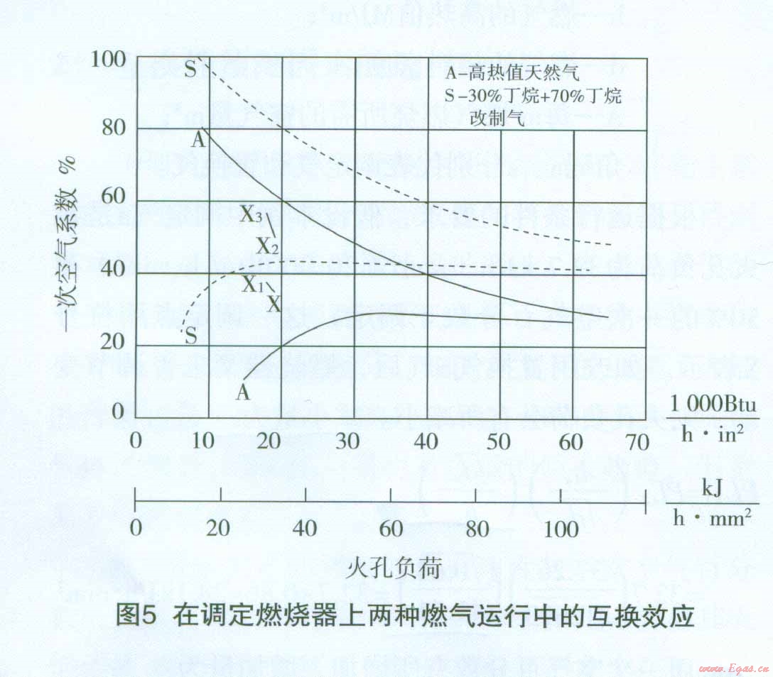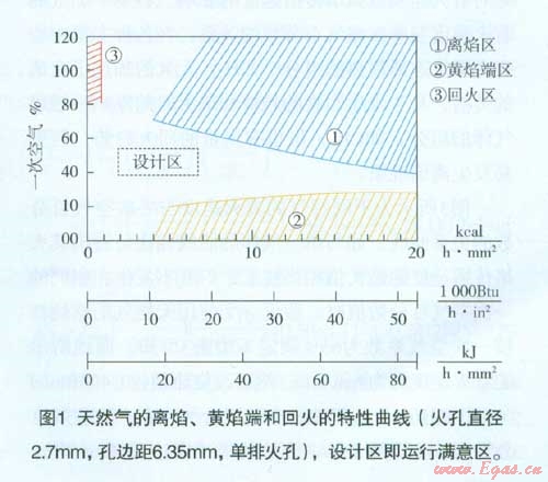 即圖4中置換后的工作點(diǎn)X3,就不會遇到離焰情況。從燃燒器的設(shè)計(jì)要求來看,對一次空氣系數(shù)就有規(guī)定的要求。以上只是從離焰曲線論離焰,不能認(rèn)為調(diào)整一次空氣系數(shù)就可解決燃?xì)獾幕Q問題。