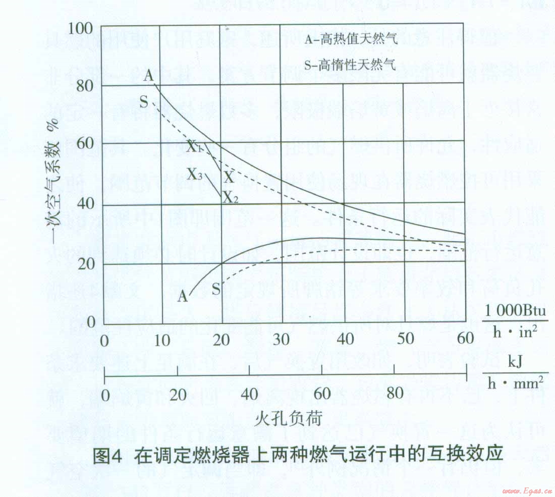 這說明用高熱值天然氣調(diào)定后的燃燒器在改用高惰性天然氣置換后,其運(yùn)行工作點(diǎn)x。已高于高惰性天然氣的離焰極限曲線值(見圖4中X1的位置),會發(fā)生離焰。顯然,如調(diào)定點(diǎn)x置于調(diào)定氣的極限曲線上(一次空氣系數(shù)接近60%一見圖4),則置換后的工作點(diǎn)X1將遠(yuǎn)高于置換氣的離焰曲線(圖上未表示),這一運(yùn)行工況是完全不能接受的。在這一特殊的假設(shè)條件下,如燃燒器的調(diào)定是在同樣的火孔負(fù)荷下,但一次空氣系數(shù)略低于50%(約為42%,其工作點(diǎn)在圖4上用X1表示,則在用高惰性天然氣置換后,一次空氣百分?jǐn)?shù)增加到PAx3=PAX2×1.1744=0.42×1.1744=0.4932即49.30%