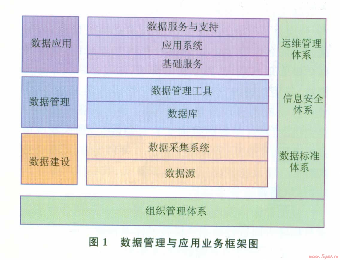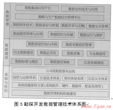 圖1中包含了數(shù)據(jù)業(yè)務(wù)體系和基礎(chǔ)保障體系。其中基礎(chǔ)保障體系包括:①組織體系,油氣田公司數(shù)據(jù)管理與應(yīng)用的組織體系建設(shè)分為決策層、領(lǐng)導(dǎo)層、管理層和執(zhí)行層4個(gè)層次;②標(biāo)準(zhǔn)體系,信息標(biāo)準(zhǔn)體系是技術(shù)體系中重要的組成部分,有2層含義,一是業(yè)務(wù)層面的業(yè)務(wù)活動(dòng)、業(yè)務(wù)單元標(biāo)準(zhǔn)化,如井、地質(zhì)構(gòu)造命名,油氣生產(chǎn)流程等,二是計(jì)算機(jī)層面的元數(shù)據(jù)標(biāo)準(zhǔn)化;③安全體系,信息安全系統(tǒng)中各個(gè)安全組件或要素只有整合成一個(gè)整體協(xié)同作用時(shí),才能有效保證企業(yè)整體安全管控的目標(biāo)得以實(shí)現(xiàn)。油氣田公司信息安全框架為油氣田公司提供一個(gè)全面的、基于信息安全建設(shè)最佳實(shí)踐的、結(jié)合了業(yè)界相關(guān)開(kāi)放標(biāo)準(zhǔn)的安全模型口3;④運(yùn)維體系,合理地建立與完善運(yùn)行維護(hù)體系,保障在用信息系統(tǒng)的正常運(yùn)行,才能滿足油氣田科研、生產(chǎn)和管理業(yè)務(wù)活動(dòng)需求。