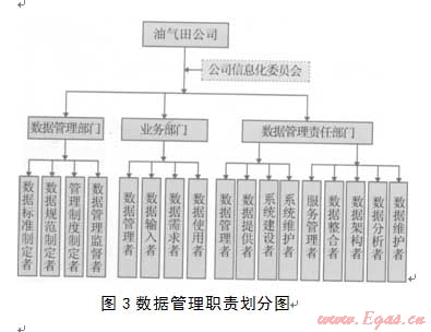 根據(jù)數(shù)據(jù)管理的目標(biāo)和主要工作內(nèi)容,油氣田公司應(yīng)對(duì)數(shù)據(jù)管理工作的具體角色和職責(zé)進(jìn)行劃分口l(圖3)。組織是數(shù)據(jù)管理體系中最重要的部分之一,是保證體系正常運(yùn)行的核心。結(jié)合各相關(guān)單位業(yè)務(wù)分工,理順數(shù)據(jù)管理各相關(guān)部門(mén)之間關(guān)系十分重要。