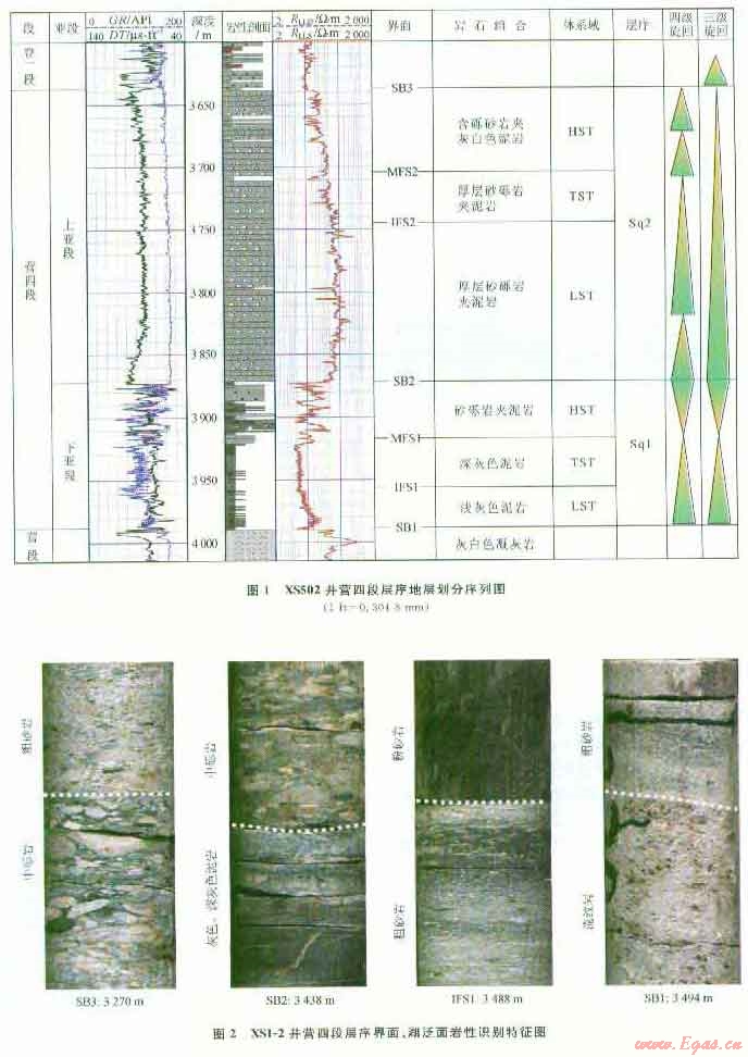 通過(guò)全井段取心井XSl—2井等多井巖心的細(xì)致觀察描述——識(shí)別巖性、巖相界面特征,多井對(duì)比和井震關(guān)系研究,根據(jù)地層發(fā)育特征、地層旋回性和巖相發(fā)育特征,對(duì)營(yíng)四段地層劃分出2個(gè)三級(jí)層序,即營(yíng)四段下層序(Sql)、營(yíng)四段上層序(Sq2)和6個(gè)四級(jí)層序(圖1、2)[2]。