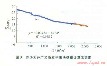 圖3為蘇5-X氣井采用廣義物質平衡法儲量計算示意圖。該井于2007年10月13號投產(chǎn),截至2010年底累計采氣量達到了2574.21×104m3,2009年12月氣體流動達到擬穩(wěn)定狀態(tài),通過線性直線關系得到:G=14286.36×104m3。