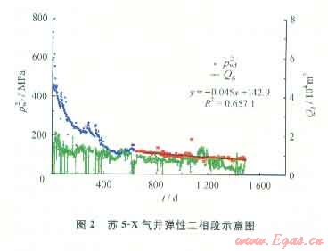 針對致密低滲儲層的滲流特征,假定儲層遠端存在著一個移動的、基本不滲透的(實際上是低滲)模糊邊界,當氣井穩(wěn)定生產(chǎn)一段時間后,壓力波及會觸及到此邊界,此時產(chǎn)量、壓力會出現(xiàn)“擬穩(wěn)態(tài)”(圖2),在求取Pwf2-t關系曲線(近似直線)斜率后,可利用彈性二相法估算壓力波及范圍內的可動儲量。該儲量僅能代表壓力波及范圍內的可動儲量,隨著日后生產(chǎn)繼續(xù),累積產(chǎn)氣量增加,需要重復計算予以進一步核實和校正。實踐證明,在不關井情況下,彈性二相法儲量具有重要的參考價值。蘇5區(qū)塊達到計算條件的氣井有41口,