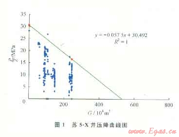 圖1為蘇5-X氣井的壓降儲量計算示意圖。該井于2006年10月12號投產(chǎn),截至2010年底已累計采出天然氣243.12×104m3,根據(jù)曲線可計算得到:G=530.26×104m3