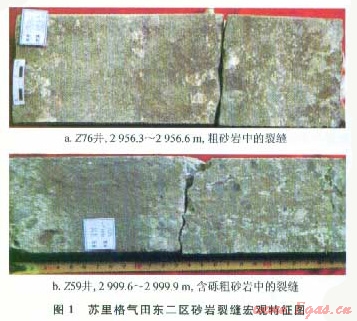 根據(jù)巖心觀察、鑄體薄片、掃描電鏡等觀察分析,發(fā)現(xiàn)研究區(qū)發(fā)育高角度構(gòu)造裂縫以及水平層理縫、粒內(nèi)縫和粒緣縫等成巖裂縫。裂縫的發(fā)育在研究區(qū)北部較普遍,鉆井巖心中宏觀構(gòu)造縫較常見,多為高角度裂縫(圖1),巖心中裂縫長度一般0.5~2m,最長可達8m,裂縫寬度2~3mm。巖心觀察表明構(gòu)造裂縫特征明顯,易于與人工破裂面進行區(qū)別。即:構(gòu)造裂縫的破裂面平整,致密砂巖中的構(gòu)造裂縫較光滑,人工破裂面均呈參差狀,巖心表面常殘留有受力破碎而成的白色粉末痕跡;天然的構(gòu)造裂縫平面顏色黯淡,常有礦物膠結(jié)或充填,而人工破裂面新鮮干凈;天然構(gòu)造裂縫常常平行密集分布,從而將巖心切割為薄板狀。研究區(qū)構(gòu)造裂縫多為開啟性裂縫,少數(shù)見方解石半充填。