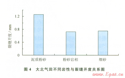 大北單井平均裂縫開(kāi)度統(tǒng)計(jì)結(jié)果表明,在泥質(zhì)粉砂巖中裂縫開(kāi)度最大,平均開(kāi)度大于l.2 mm;粉砂巖、細(xì)砂巖裂縫平均開(kāi)度相差不大,平均裂縫開(kāi)度都介于0.80.9 mm之間(4),裂縫的存在大大改善了泥質(zhì)粉砂巖的孔隙度和滲透率,提高了單井產(chǎn)能。