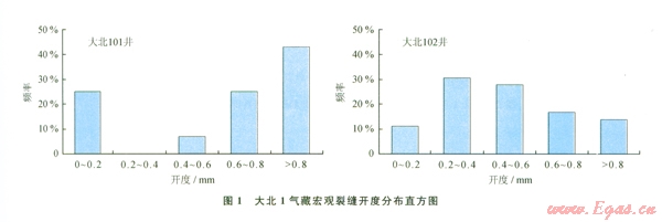 根據(jù)巖心觀察和校正后,大北氣田儲(chǔ)層段宏觀裂縫開(kāi)度大于0.2 mm占多數(shù)(1),其中大北101井開(kāi)度大于0.2 mm75%;小于0.2 mm的占25%。大北102井開(kāi)度大于0.2 mm占統(tǒng)總數(shù)的89%,說(shuō)明儲(chǔ)層宏觀裂縫開(kāi)度發(fā)育,對(duì)氣藏開(kāi)發(fā)具有建造性作用。