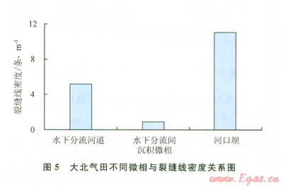 而根據(jù)單井統(tǒng)計(jì)的裂縫線密度與沉積微相的關(guān)系圖表明:河口壩平均裂縫線密度為11條/m,平均裂縫線密度最大,裂縫最發(fā)育;水下分流河道微相平均裂縫線密度為5條/m;分流間灣裂縫最不發(fā)育,平均線密度只有不到1條/m(5)。