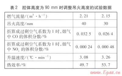 吊火高度過(guò)低則排煙不暢,影響一次空氣的引入而導(dǎo)致煙氣中的C0含量偏高;吊火高度過(guò)高,煙氣中的C0含量雖然低,但影響了熱效率。因此,在保證煙氣中C0含量達(dá)到相關(guān)標(biāo)準(zhǔn)的前提下,應(yīng)盡可能降低吊火高度。經(jīng)試驗(yàn)得出,吊火高度取30~40 mm比較合適。