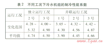 冷水系統(tǒng)基本處于定流量運(yùn)行。冷水機(jī)組并聯(lián)運(yùn)行工況為1號機(jī)組與2、3號任意一臺機(jī)組并聯(lián)運(yùn)行,當(dāng)2號或3號冷水機(jī)組負(fù)荷率達(dá)到95%及以上時開啟1號冷水機(jī)組并聯(lián)運(yùn)行。對測試數(shù)據(jù)進(jìn)行整理,得到不同工況下冷水機(jī)組的制冷性能系數(shù)(見表2)。冷水循環(huán)泵效率的變化范圍為73.16%~75.83%,平均值為73.78%。冷水系統(tǒng)輸送能效比變化范圍為0.021 5~0.029 9,平均值為0.026 3。