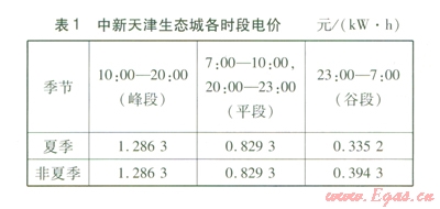 燃?xì)鈨r(jià)格按照2.4 元/m3計(jì)算,中新天津生態(tài)城各時(shí)段電價(jià)見表l。此外,燃?xì)廨啓C(jī)部分負(fù)荷率下降到0.5以下時(shí)熱效率下降嚴(yán)重,因此將燃?xì)廨啓C(jī)部分負(fù)荷率≥0.5作為約束條件。將以上參數(shù)輸入到優(yōu)化評(píng)價(jià)模型就可得到聯(lián)供系統(tǒng)的最優(yōu)設(shè)備配置和運(yùn)行策略。