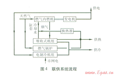由于該辦公樓規(guī)模較小,岡此聯(lián)供系統(tǒng)采用燃?xì)鈨?nèi)燃機(jī)發(fā)電機(jī)組(包括燃?xì)鈨?nèi)燃機(jī)、發(fā)電機(jī))+余熱型吸收式冷熱水機(jī)組(以下簡(jiǎn)稱吸收式機(jī)組),聯(lián)供系統(tǒng)流程見(jiàn)圖4。燃?xì)鈨?nèi)燃機(jī)燃燒天然氣發(fā)電,吸收式機(jī)組利用燃?xì)鈨?nèi)燃機(jī)排放煙氣、缸套冷卻水制冷、制熱,缸套冷卻水也可以通過(guò)換熱器直接供熱,不足冷、熱量由電制冷機(jī)組、燃?xì)忮仩t補(bǔ)充。電制冷機(jī)組優(yōu)先使用聯(lián)供系統(tǒng)所發(fā)電力,不足電量由市電網(wǎng)補(bǔ)充。