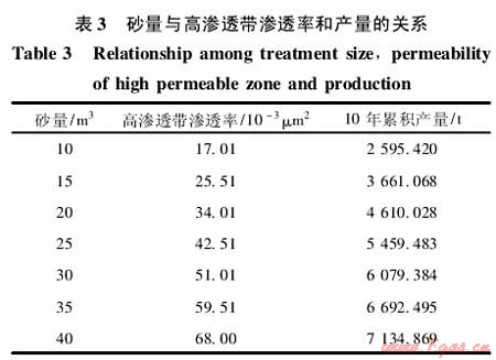 從表3知,隨著加砂規(guī)模的增大,高滲透帶的滲透率和壓裂后的產(chǎn)量逐漸增大,當單簇高滲透帶加砂規(guī)模大于25m3時,累積產(chǎn)量增加趨勢減緩。由圖7和圖8數(shù)值模擬結果知本井優(yōu)化的高滲透帶滲透率上限為40×10-3μm2,對應的砂量為20~25m3。綜合考慮施工風險,建議本井高滲透帶滲透率取30×10-3μm2左右,每簇高滲透帶的砂量為15~20m3。