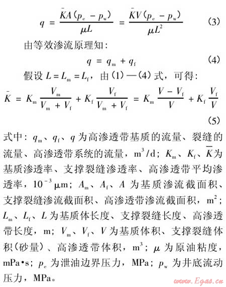 式(5)建立了單簇高滲透帶系統(tǒng)滲透率、基質(zhì)滲透率、支撐裂縫滲透率與高滲透帶體積、支撐裂縫體積(砂量)之間的關系。
