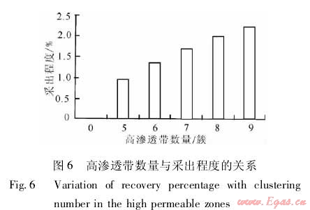 從圖5可見,當高滲透帶數(shù)量為0,即儲層不壓裂時,此時井筒全靠儲層基質(zhì)滲流,10年時間的累積產(chǎn)量僅1t,基本無產(chǎn)能;高滲透帶數(shù)量為7簇時,累積產(chǎn)量4297t,采出程度1.72%;8簇時,累積產(chǎn)量4993.7t,采出程度2.0%;9簇時,累積產(chǎn)量5476.0t,采出程度2.19%(圖6)。