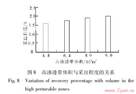 圖7描述了高滲透帶數(shù)量為8簇時,單簇高滲透帶體積與累積產(chǎn)量的關系。單簇高滲透帶體積為8.0×104m3時,累積產(chǎn)量為4790.8t,采出程度1.9%;高滲透帶體積為9.6×104m3時,累積產(chǎn)量4995.8t,采出程度2.0%(圖8)??梢姡S著高滲透帶體積增加,累積產(chǎn)量、采出程度增加,當單簇高滲透帶體積大于8.0×104m3時,累積產(chǎn)量、采出程度增加減緩。為最大限度地提高本井采出程度,兼顧斷層影響,最終確定單簇高滲透帶體積為9.6×104m3。