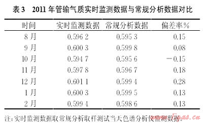 (2)在線色譜分析儀安裝投運后,為驗證該臺色譜儀實際運行效果,從2011年8月開始,對色譜儀氣質(zhì)實時監(jiān)測數(shù)據(jù)和常規(guī)取樣分析數(shù)據(jù)進(jìn)行對比(表3)。從投運7個月的天然氣相對密度對比情況來看,實時監(jiān)測數(shù)據(jù)與常規(guī)監(jiān)測數(shù)據(jù)最大偏差出現(xiàn)在12月,為0.28%,其余月份偏差較小。除儀器固有分析誤差和常規(guī)分析時產(chǎn)生的泄漏等人為或器械故障原因?qū)е鲁霈F(xiàn)不可克服的分析偏差外,色譜儀實時監(jiān)測數(shù)據(jù)運行總體保持平穩(wěn)。根據(jù)實時監(jiān)測數(shù)據(jù)變動情況可知,10月初因下游用氣需求發(fā)生較大變化,期間壓減了某一氣源的日接氣量,導(dǎo)致相對密度變化較大。此時如果采用常規(guī)分析檢測手段將無法實時反映這種氣質(zhì)變化,從而導(dǎo)致產(chǎn)生較大計量偏差。而安裝在線色譜儀后,可以實時采集到管道內(nèi)的最新氣體組分,便于在上游進(jìn)行流程切換時,及時掌握氣質(zhì)變化情況,提高了計量精度[3]。