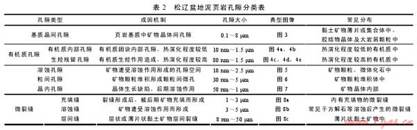 Milner等曾針對(duì)北美侏羅系Haynesville頁巖、泥盆系Horn River 頁巖、密西西比系 Barnett 頁巖及泥盆系Marcellus頁巖中的微觀孔隙進(jìn)行系統(tǒng)觀察,發(fā)現(xiàn)上述4套泥頁巖中主要發(fā)育3種類型孔隙,即基質(zhì)晶間孔、有機(jī)質(zhì)孔和粒間孔[19]。本研究對(duì)松遼盆地白堊系青山口組泥頁巖進(jìn)行了大量、系統(tǒng)的觀察,除了發(fā)現(xiàn)上述3種孔隙外,在該套頁巖中還發(fā)現(xiàn)了溶蝕孔隙與晶內(nèi)孔隙,即松遼盆地白堊系青山口組泥頁巖中發(fā)育基質(zhì)晶間孔、有機(jī)質(zhì)孔、溶蝕孔、粒間孔和晶內(nèi)孔共5類孔隙,此外,泥頁巖中還發(fā)育大量的微米—納米級(jí)微裂縫(見表2、圖3—圖8)。