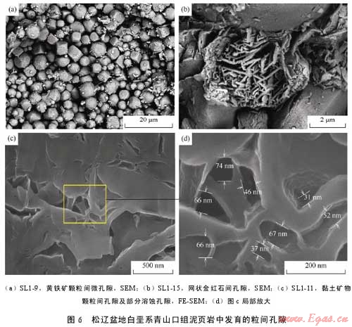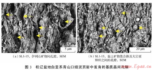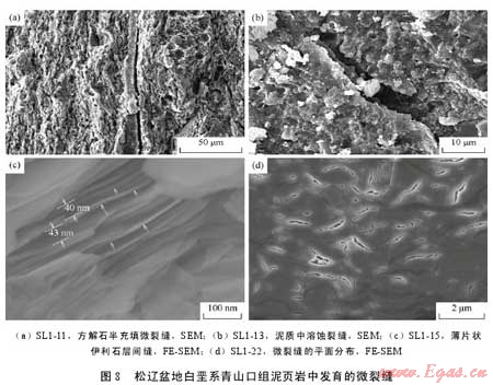 摘 要:為了查明泥頁巖系統(tǒng)微觀孔隙發(fā)育特征及其油氣地質(zhì)意義,利用掃描電鏡及場(chǎng)發(fā)射掃描電鏡二次電子成像技術(shù)對(duì)松遼盆地白堊系青山口組一段泥頁巖中的微觀孔隙進(jìn)行了系統(tǒng)觀察。該套泥頁巖中主要發(fā)育了5種類型孔隙,即基質(zhì)晶間孔、有機(jī)質(zhì)孔、溶蝕孔、粒間孔、晶內(nèi)孔;此外,還發(fā)育大量微米—亞微米級(jí)(納米級(jí))微裂縫,包括溶蝕縫、充填縫及層間縫3類。微孔隙和微裂縫構(gòu)成復(fù)雜微裂縫網(wǎng)絡(luò)-孔隙系統(tǒng),為烴源巖生成的油氣向外排驅(qū)提供了有效通道,同時(shí)也為殘留在頁巖中的油氣提供了充分的儲(chǔ)集空間,對(duì)于油氣的初次運(yùn)移以及頁巖油氣等非常規(guī)資源的儲(chǔ)集具有重要意義。