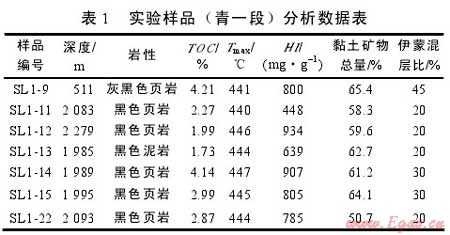 實(shí)驗(yàn)樣品取自松遼盆地北部齊家古龍凹陷、三肇凹陷白堊系青山口組一段泥頁巖(見圖1)。實(shí)驗(yàn)樣品有機(jī)質(zhì)豐度較高(見表1),有機(jī)碳含量平均2.89%;有機(jī)質(zhì)類型以Ⅰ、Ⅱ1型為主,氫指數(shù)一般在639~934mg/g;樣品主要處于中成巖作用階段,伊蒙混層比平均26.4%。全巖分析實(shí)驗(yàn)表明,樣品中黏土礦物含量較高,為50.7%~65.4%,平均60.3%,其次為石英(17.5%~25.0%)、斜長石(7%~12%)、黃鐵礦(3%~6%)、方解石(1%~5%),此外還有少量的鉀長石、白云石和菱鐵礦,不含赤鐵礦和方沸石(見圖2)。