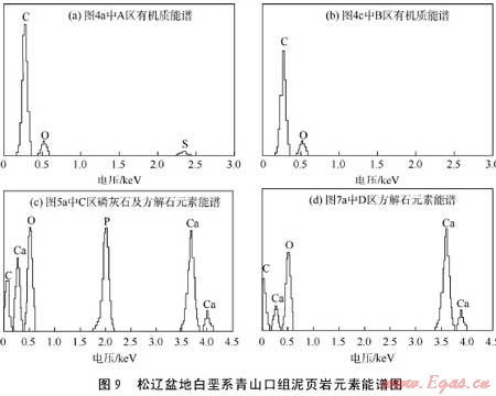 有機(jī)質(zhì)孔隙主要指有機(jī)質(zhì)團(tuán)塊內(nèi)部或有機(jī)質(zhì)生烴后內(nèi)部殘留的孔隙。圖4為場(chǎng)發(fā)射掃描電鏡二次電子成像后觀察到的泥頁巖樣品中的有機(jī)質(zhì)孔隙,圖4a為有機(jī)質(zhì)團(tuán)塊中的孔隙(圖4a中黃線標(biāo)出的黑灰色區(qū)域A區(qū)對(duì)應(yīng)的元素能譜見圖9a),孔徑為10~1500nmz已經(jīng)向烴類轉(zhuǎn)化,伴隨這一地質(zhì)過程,泥頁巖中產(chǎn)生大量有機(jī)質(zhì)生烴后的殘留孔隙,若泥頁巖處于高—過成熟階段,有機(jī)質(zhì)生烴后的殘留孔隙數(shù)量會(huì)大幅增加,其孔徑也會(huì)變大。