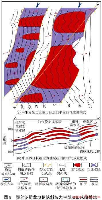 低幅度構(gòu)造的發(fā)育為伊陜斜坡上油氣的逸散或富集提供了必要條件。低幅度構(gòu)造局部產(chǎn)狀的陡緩變化影響運移通道中油氣沿斜坡上傾方向的運移動力、運移速度及運移方向,從而導(dǎo)致油氣運移途中發(fā)生局部或較大區(qū)域的逸散或富集,控制油氣水在空間上的分異與分布,形成相對的油氣富集區(qū)及含水較高的含油水區(qū),通常前者發(fā)育于低幅度構(gòu)造的高部位,后者則處于諸如鼻凹等低幅度構(gòu)造的較低部位或較大規(guī)模鼻褶群帶間的低洼分隔區(qū)。低幅度構(gòu)造坡折帶轉(zhuǎn)折端端點連線與沉積相帶邊側(cè)部的巖性/物性尖滅線及局部的地層尖滅線等界線組合可形成巖性-構(gòu)造、構(gòu)造-巖性、地層-構(gòu)造等復(fù)合圈閉以及較大的圈閉空間,有效地阻滯、封堵油氣運移,并截留、捕獲過路油氣,進(jìn)而聚集形成油氣藏。繼承性發(fā)育的低幅度構(gòu)造與多期次沉積的儲集層疊合,促成了垂向上多層系油(氣)藏的復(fù)合發(fā)育。低幅度構(gòu)造與大型沉積體系及其有利相帶等條件組成優(yōu)勢配置,控制了伊陜斜坡內(nèi)中生界乃至古生界主要的油氣分布,奠定了盆地大面積成藏及大中型油氣田發(fā)育的地質(zhì)基礎(chǔ)。