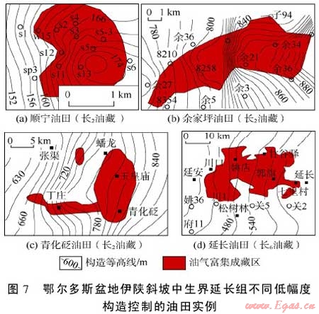 上述高產(chǎn)油氣藏均處于低幅度構(gòu)造發(fā)育區(qū)內(nèi),其勘探實踐證明:①伊陜斜坡上的油氣水分布具有一定分異性;②低幅度構(gòu)造對油氣分布、富集、成藏以及油井產(chǎn)能等具有舉足輕重甚至是決定性的作用;③低幅度構(gòu)造發(fā)育區(qū)即是油氣的有利富集區(qū)。
