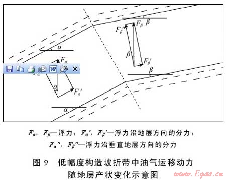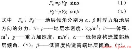低幅度構(gòu)造為油氣的逸散或富集提供了必要條件。伊陜斜坡整體為平緩的西傾單斜,地層傾角約1°,但大單斜的內(nèi)部發(fā)育大量各種類型的低幅度構(gòu)造,鼻狀構(gòu)造是其基本的構(gòu)成單元,其斷面形態(tài)呈現(xiàn)出連續(xù)和反復(fù)的具一定起伏的坡折特性。在鼻狀構(gòu)造的翼部,地層變陡,傾角比正常情況下增大3°~5°甚至更大;在鼻狀構(gòu)造的高端部位或低洼處,地層轉(zhuǎn)趨平緩,傾角比正常情況減小1°~2°甚至更大角度(見圖8)。根據(jù)油氣運移理論,在水條件下,浮力是油氣二次運移最主要的動力[27]。對于鄂爾多斯盆地中生界特低滲—超低滲致密砂巖儲集層而言,浮力對油氣二次運移更為關(guān)鍵,其他動力如水動力等作用極小。如果地層傾斜且其上為蓋層所封閉,當(dāng)油氣上浮到儲集層頂面時,在浮力作用下油氣必沿其上傾方向繼續(xù)運移;浮力沿地層方向分力的大小不僅與地層水密度有關(guān),還與地層的傾角有關(guān)[27]。如果低幅度構(gòu)造翼部地層傾角為α,至構(gòu)造高端轉(zhuǎn)變?yōu)?beta;(見圖9),則油氣的上浮分力會相應(yīng)地增大或減小(如公式(1)、(2)所示)。因此,低幅度構(gòu)造坡折帶地層產(chǎn)狀的陡緩變化影響運移通道中油氣沿斜坡上傾方向的運移動力、速度及方向等,使得油氣在局部區(qū)間或減速滯留聚集成藏或加速擴(kuò)散。