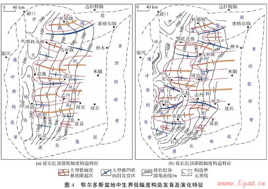 低幅度構(gòu)造是低滲透—超低滲透致密砂巖非常規(guī)油氣藏的主要控制因素之一。鄂爾多斯盆地伊陜斜坡上的低幅度構(gòu)造具有區(qū)域性、規(guī)?;l(fā)育,定向性延伸,排列式褶合,繼承性演化等特點,從而為盆地內(nèi)部中生界大中型油田的發(fā)育準(zhǔn)備了配套條件。