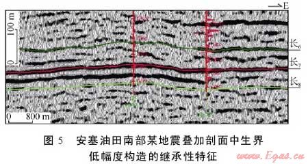 低幅度構(gòu)造具有繼承性發(fā)育和演化的特點。圖3a、3b基本處于同一區(qū)域,延安組、延長組低幅度構(gòu)造的平面組合基本一致,圖4a、4b也具有同樣的一致性特點,這充分反映鄂爾多斯盆地中生界延安組、延長組的低幅度構(gòu)造是繼承性發(fā)育和演化的。圖5地震剖面清楚地顯示出某油田南部延長組上、下層序中起伏一致的低幅度構(gòu)造特征,且構(gòu)造高部位的鉆井中長6段的試采產(chǎn)量比構(gòu)造低處鉆井的試采產(chǎn)量明顯偏高,這不僅從剖面組合上進(jìn)一步印證了低幅度構(gòu)造的繼承性發(fā)育特點,而且也證明了低幅度構(gòu)造對油氣富集成藏具有重要的控制作用。此外,低幅度構(gòu)造的發(fā)育也具有一定的演化差異,主要表現(xiàn)在地層自下而上,其中低幅度構(gòu)造的定向性及構(gòu)造幅度有所加強(qiáng),閉合度增大,但復(fù)合規(guī)模則有所減小,圖3c、3d中長6和長2油層組的頂面構(gòu)造特征及其差異能夠充分說明這一點。